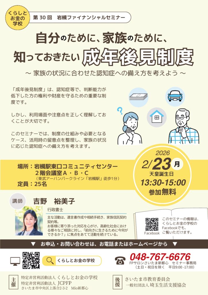 このセミナーでは、制度の仕組みや必要となるケース、活用時の留意点を整理し、家族の状況に応じた認知症への備え方を考えます。