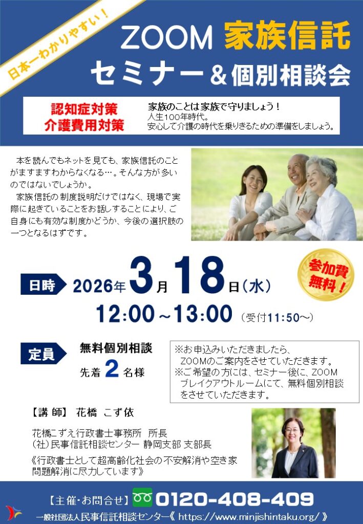 【参加受付】2026年3月18日(水)ZOOMセミナー 12:00~/日本一わかりやすい家族信託セミナー